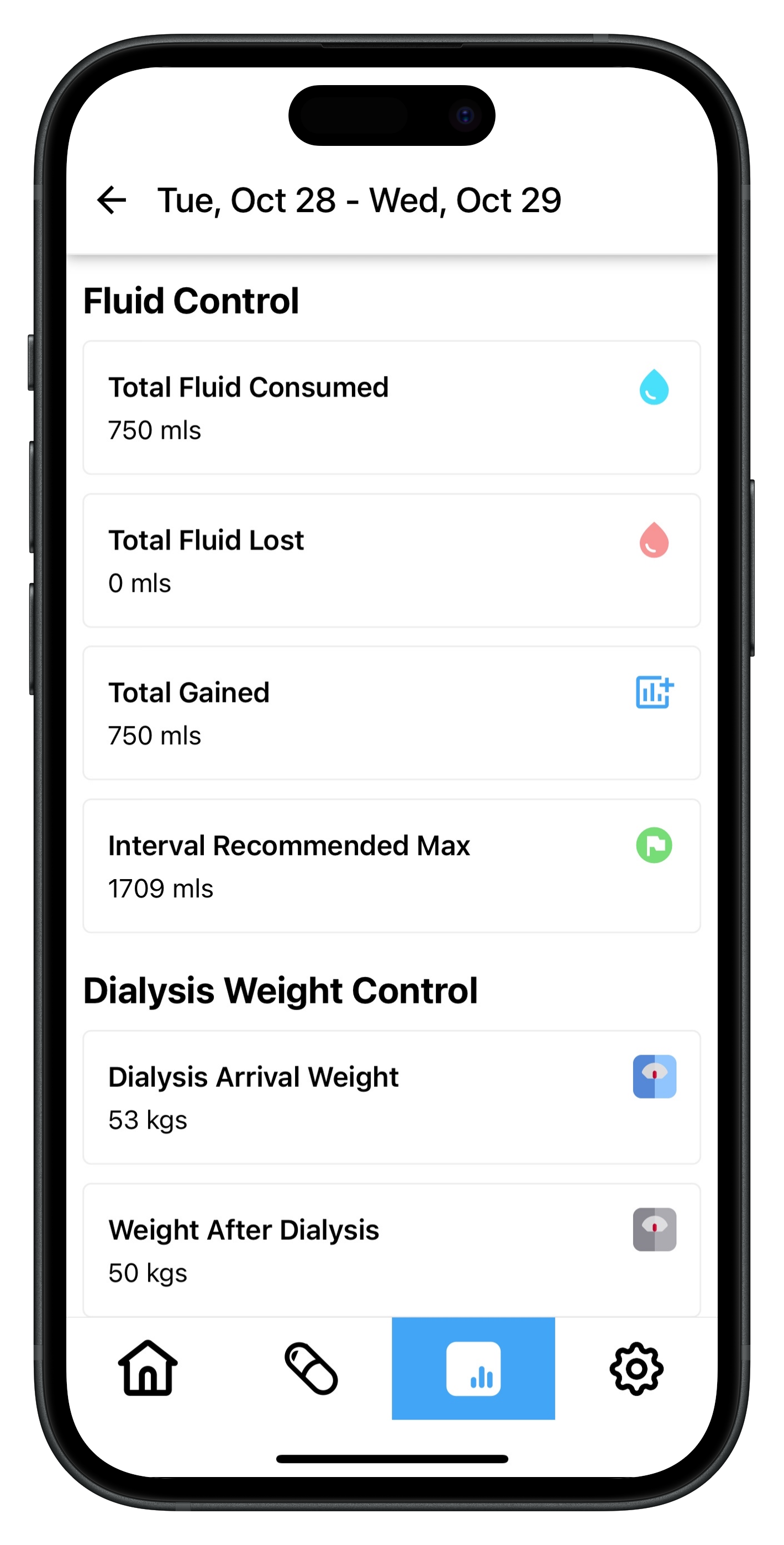 Track weight changes over time and share clear insights with your care team to help guide dry-weight adjustments.