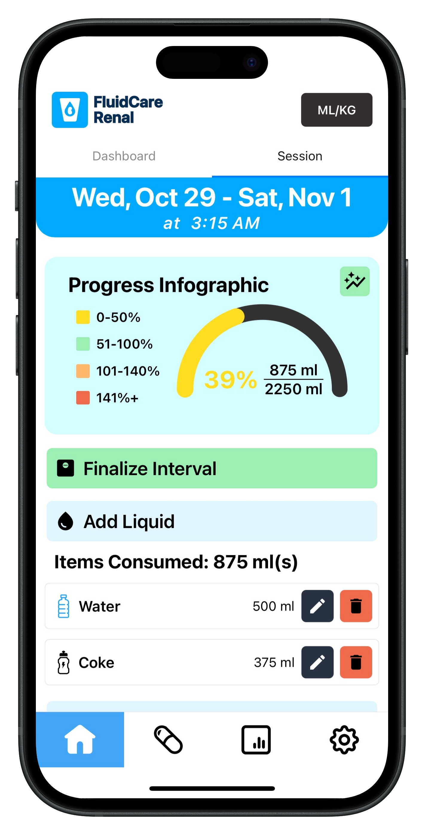 Track your fluid intake between sessions with a clear progress meter, and quickly log what you drink as the day goes on.